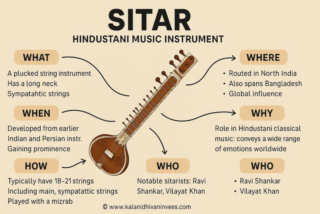 • Sitar: A plucked string instrument of Hindustani classical music, known for its resonant sound. • Sympathetic Strings (Tarab): Additional strings that vibrate sympathetically, enriching the resonance. • Gourd (Tumba):